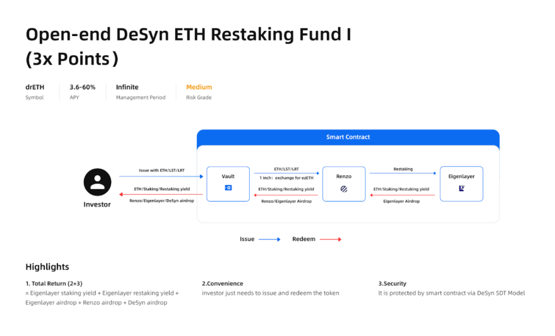 DeSyn ETH Restaking Fund I ( 3x Points) 是由专业的去中心化资产管理 DAO 组织基于 DeSyn 平台基础设施推出的再质押开放式基金产品。该产品整合了备受关注的 Eigenlayer 和 Renzo 两个再质押平台。用户可通过 DeSyn 平台质押 ETH、stETH、wETH 以及 ezETH 进行申购。***该基金支持随存随取,除了享有几个平台已有的 APY 外,还能获得 Eigenlayer、Renzo 以及 DeSyn 的三重收益预期。***目前,DeSyn ETH Restaking Fund I ( 3x Points) 的 APY 为 3.6% - 60%。在安全性方面,DeSyn 所有合约代码均已通过安全审计,确保用户的资产安全有保障。